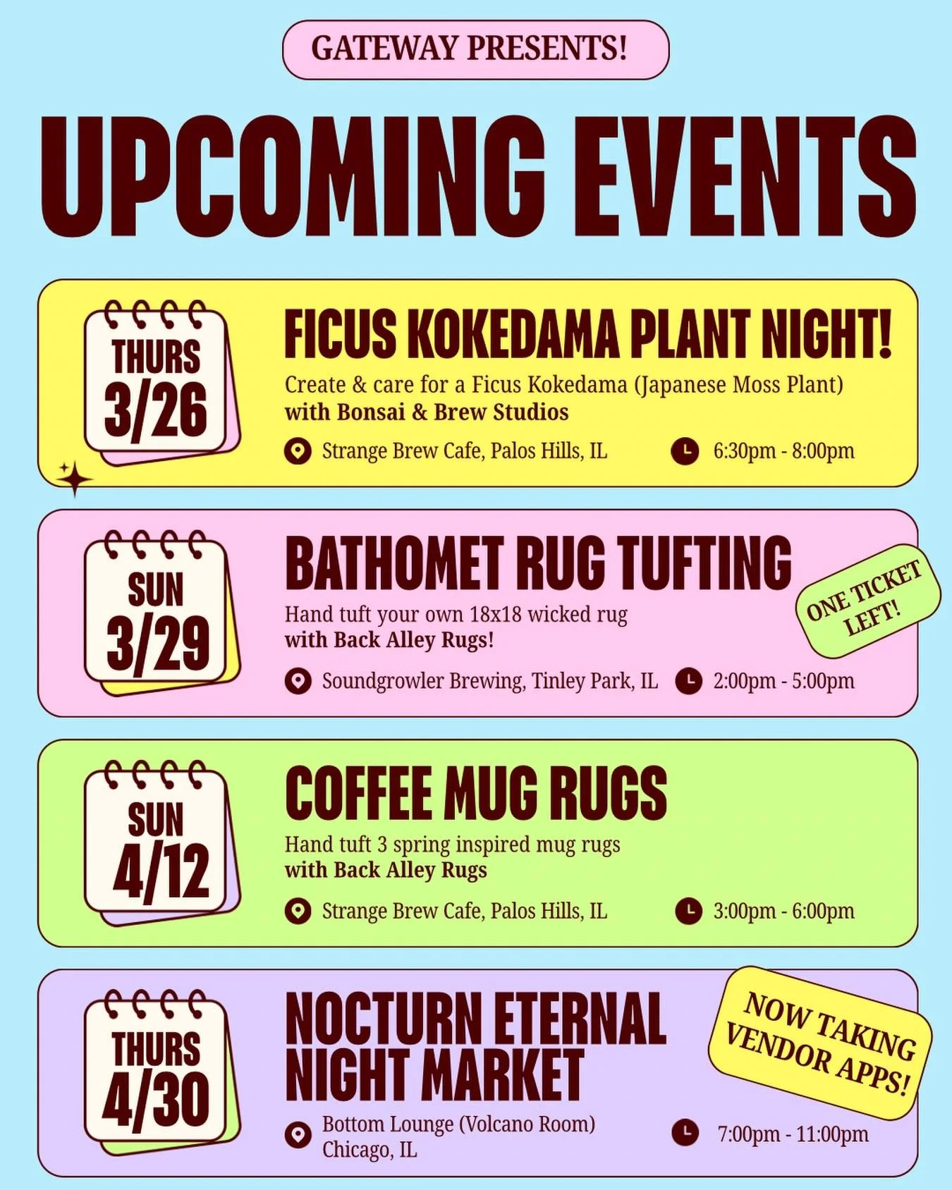 Our events feature the best creatives, teachers, and makers in our community offering experiential opportunities for imagination, reflection, and connection with others. Whether you’re looking for an experience solo, with a loved one, or among a group of friends, we have plenty of unique events each month that you won’t find anywhere else!